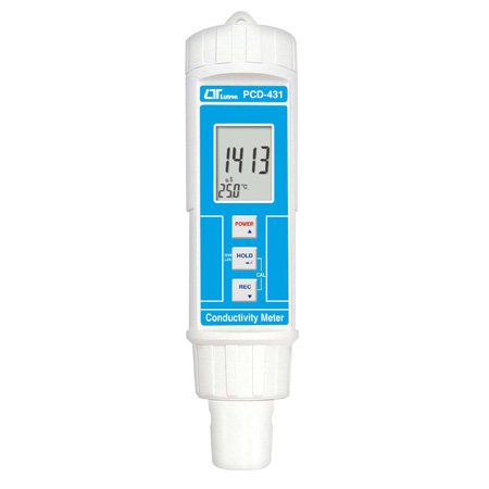 Lutron Conductivity Meter - PCD-431 FEATURES * 2 ranges : 2,000 uS, 20 mS. * Temperature measurement, ℃/℉ * Automatic temperature compensation. * Probe with the meter, all in one. * Carbon rode electrode, high reliability. * Data hold, Record ( max., min. ). * IP-67 Water resistance, heavy duty. * External calibration buttons. * DC 1.5V battery ( UM-4, AAA ) x 4. Conductivity Series